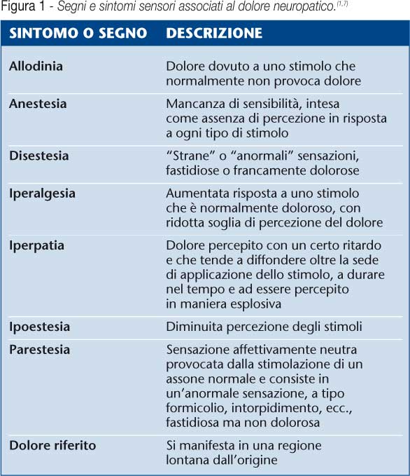 Il dolore neuropatico è associato a numerosi tipi di segni e sintomi sensori che possono presentarsi da soli o insieme ad altre specifiche manifestazioni nei pazienti con dolore neuropatico, come illustrato nella figura 1.(1,7)