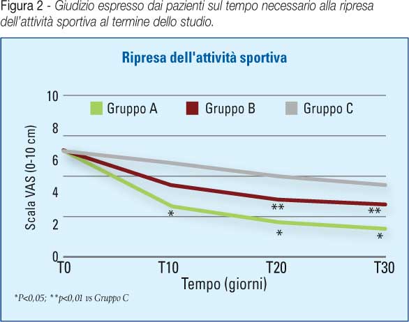 Dall’analisi dei dati raccolti è emerso che in tutti e tre i gruppi si è osservato un miglioramento sintomatologico ma con differenze tra i gruppi in studio. Nei pazienti del Gruppo A (Terapia conservativa + infiltrazione i.a. con AI 1,6% + Ligatender) è stato infatti osservato un più rapido e significativo sollievo dal dolore rispetto ai gruppi B e C (Figura 1). Inoltre, al termine dello studio, la percentuale di pazienti che hanno ottenuto un punteggio ottimo + buono relativo alla ripresa dell’attività sportiva è risultata significativamente maggiore per i pazienti del Gruppo A rispetto a quelli dei Gruppi B e C, e per i pazienti del Gruppo B rispetto a quelli del Gruppo C. (Figura 2)